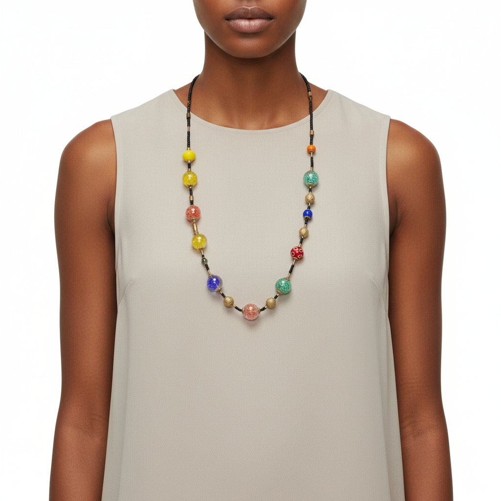 - Beads/stones/composition: blown glass, recycled glass, malachite, seed beads, clay, brass