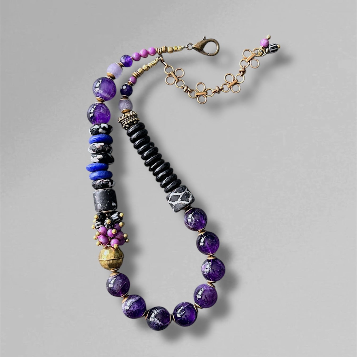 The Zuri Twilight Necklace is your ticket to effortless cool. Handcrafted with playful asymmetry, this mixed-media stunner blends deep amethyst, lavender, and black into a conversation starter that's rooted in modern African-inspired design. It's the kind of piece that celebrates your quirks, honors your creativity, and reminds you that contrast is where the magic happens.