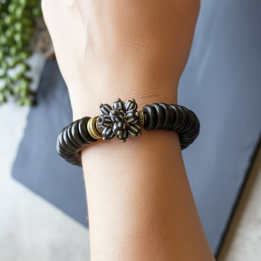 A study in black and white, this cluster bracelet is constructed with handmade, recycled glass beads from Ghana, java glass from Indonesia, and wood. This classic color combination brings a little jazz to a familiar favorite.