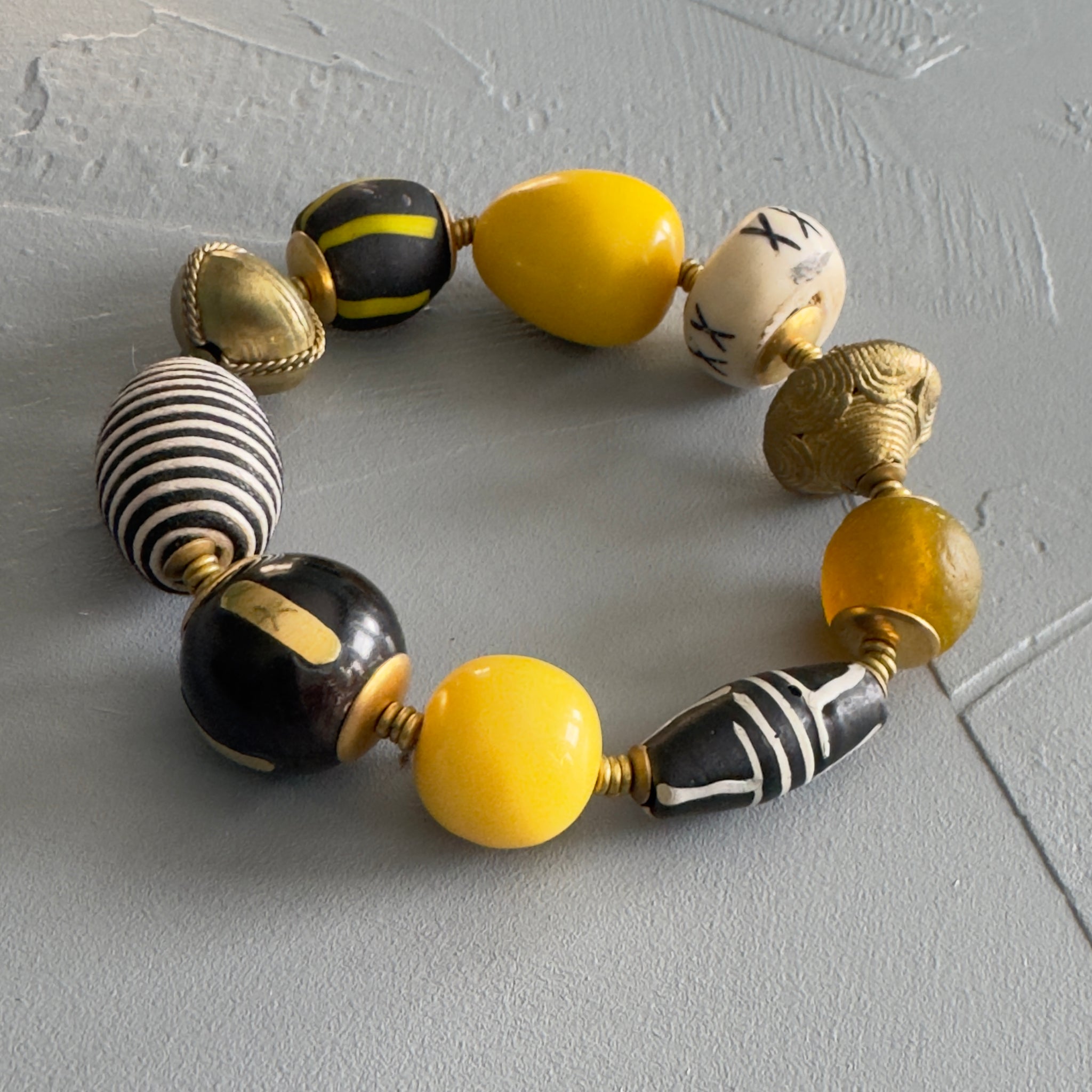 - Materials: brass, recycled glass, wood, bone, ceramic, brass, stretch cord
