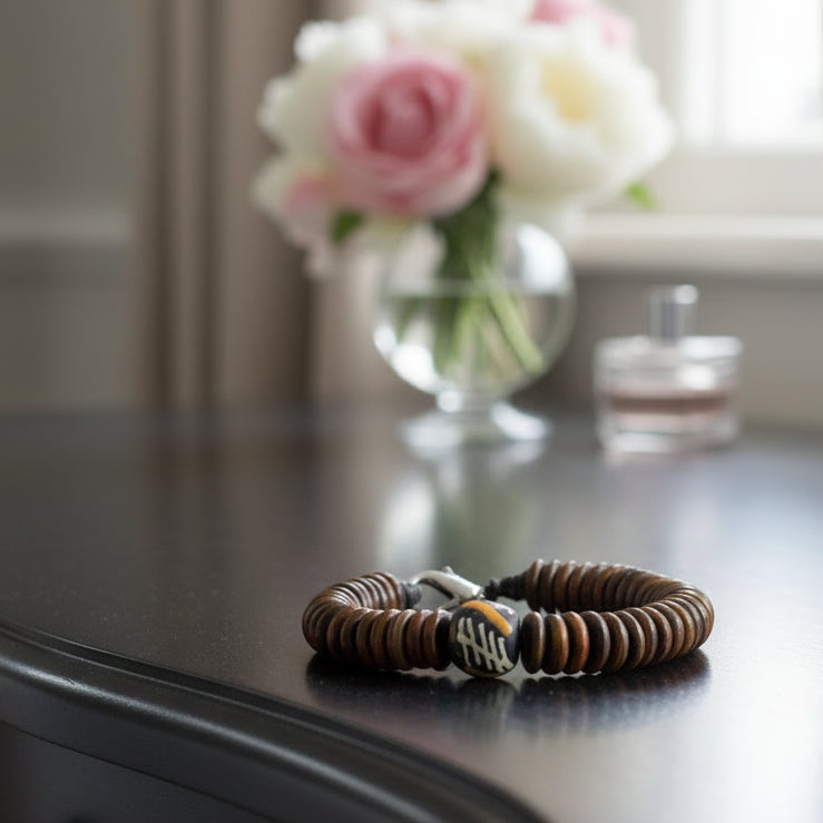 • Beads/stones/composition: recycled wood, recycled glass, and stainless steel