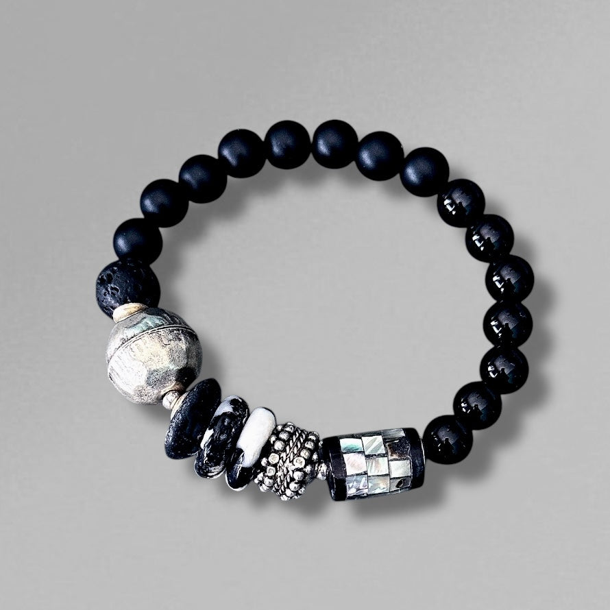 Obsidian Moon: Black and White Bracelet featuring Recycled Glass and Abalone Shell