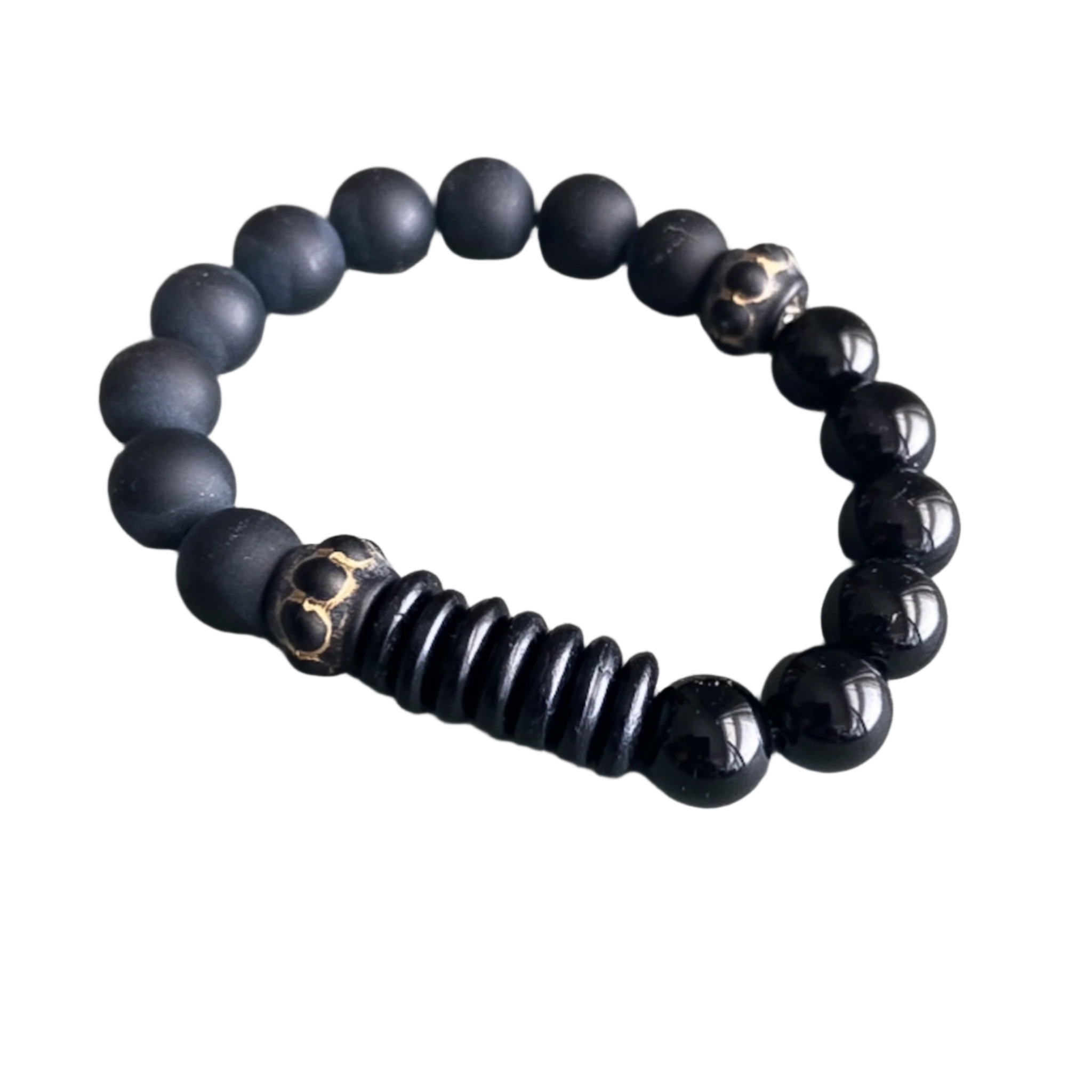 This bracelet is stunning and stylish in its simplicity. Created with both high gloss, and matte black agate, it is a study in subtle contrasts.