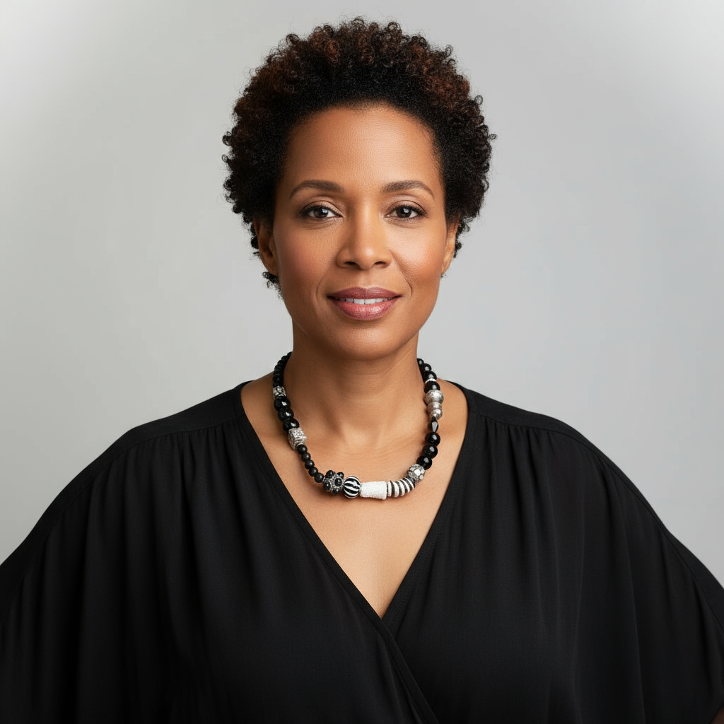 Like moonlight rippling over a midnight sea, the Lunar Tide Necklace flows with asymmetrical elegance. Handcrafted from Mala silver, black onyx, abalone shell, white druzy, and recycled glass, each element brings texture, shimmer, and movement, creating a one-of-a-kind statement piece that’s dramatic yet wearable.