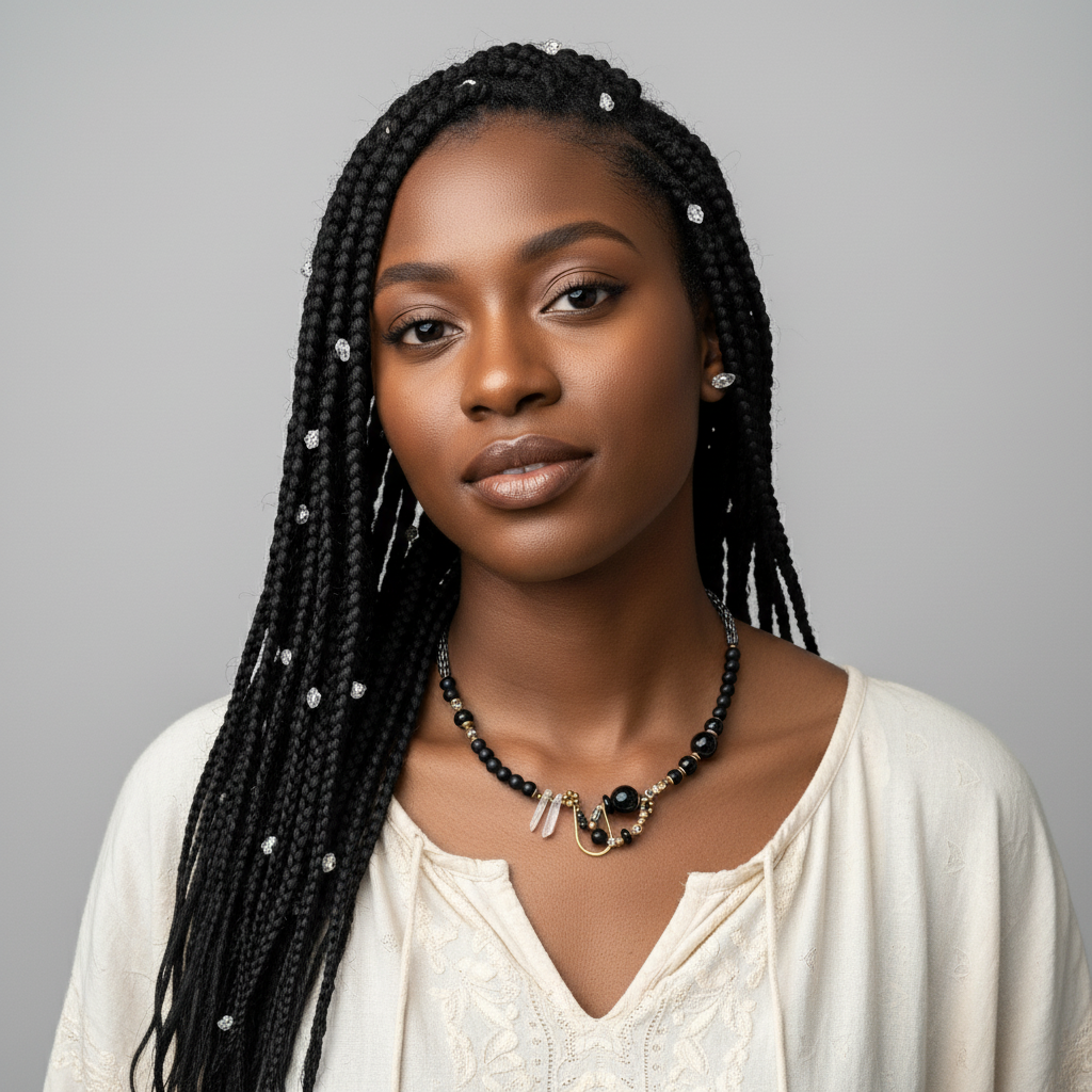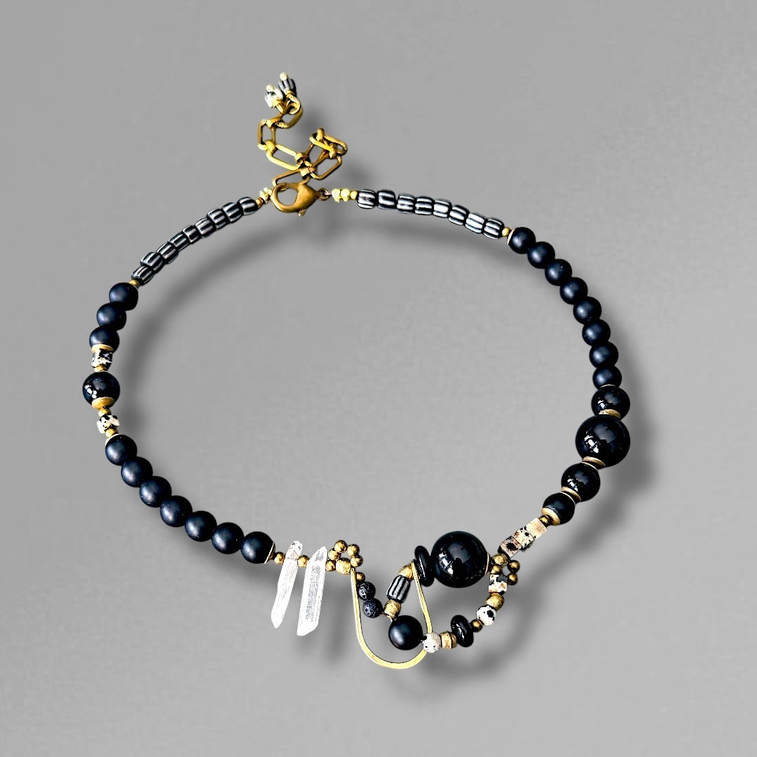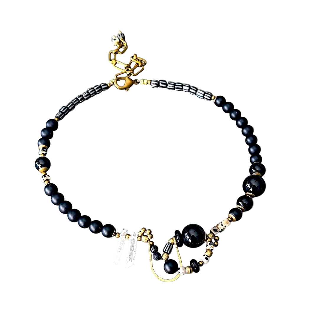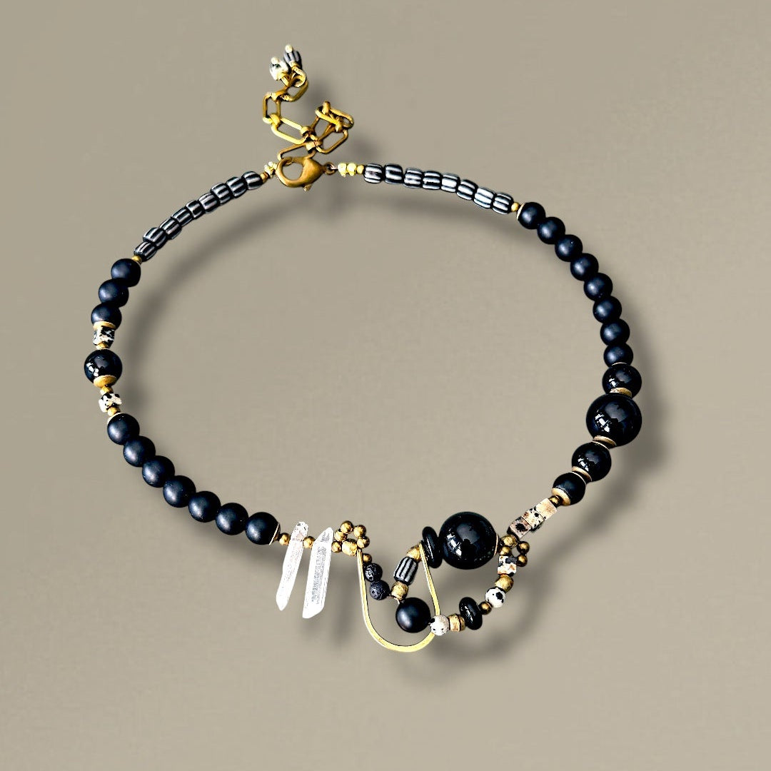 The Obsidian Veil Necklace is your ticket to effortless cool. Strung with recycled glass, quartz shards, black onyx, and Dalmatian jasper, each bead is a tiny light-catching performer—creating a dazzling show of shimmer and shadow that's different every time you wear it. It's the kind of piece that makes you feel like you've got a secret, a spark of bohemian magic wrapped around your neck. Timeless, playful, and unapologetically you.